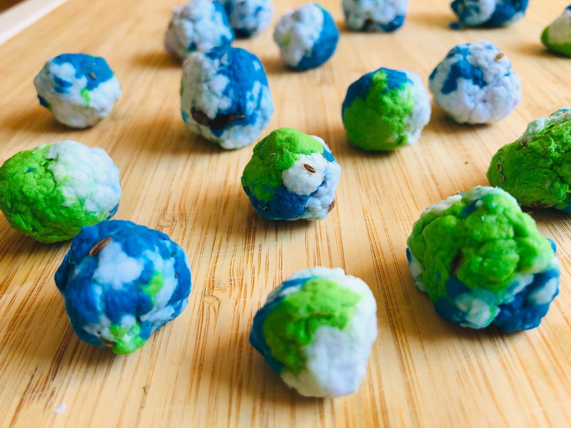 Nekaj dni pred dnevom Zemlje smo z otroki pričeli izdelovati papirnate bombice s semeni. Izdelava je zelo preprosta. Potrebujete ostanke papirja, ki jih za nekaj ur namočite. Ko je papir zmehčan, ga v mešalniku spremenite v kašo. Kašo po potrebi precedite, da ne bo preveč tekoča, nato vmešate semena in z rokami oblikujete kroglice. Oblikovane kroglice naj se čez noč sušijo na radiatorju, če pa jih izdelujete poleti, zunaj na soncu.